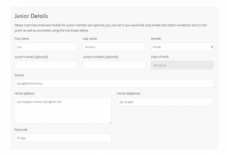 An additional junior member can be added from your profile by selecting the 'Add New Junior' button. Complete all the required contact details and consents and sign and Save the form.