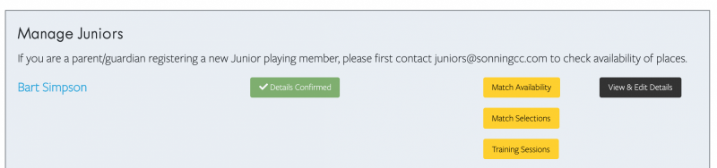 Within the Manage Juniors section on the page select 'Match Availability' alongside a junior player to view/set availability for that player.