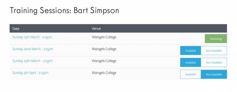 You are able to select 'Available/Not Available' for each session in order to provide an indication as to the player's likely availability for that session. Selecting 'Available/Not Available' does not have to be a firm commitment, it can be changed at any time. We would appreciate it if you could keep this information as up-to-date as possible as this information is helpful to coaches as it gives them an indication of the likely numbers attending a particular training session and lets them plan accordingly.